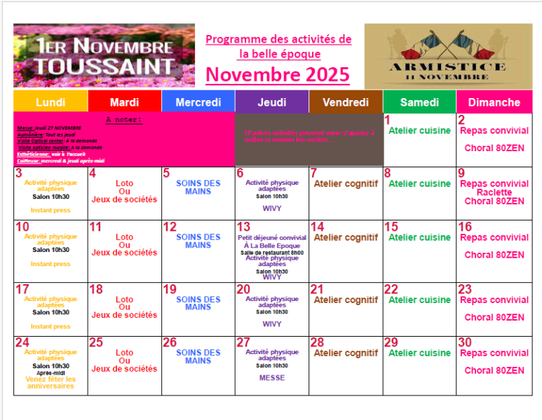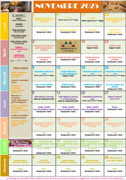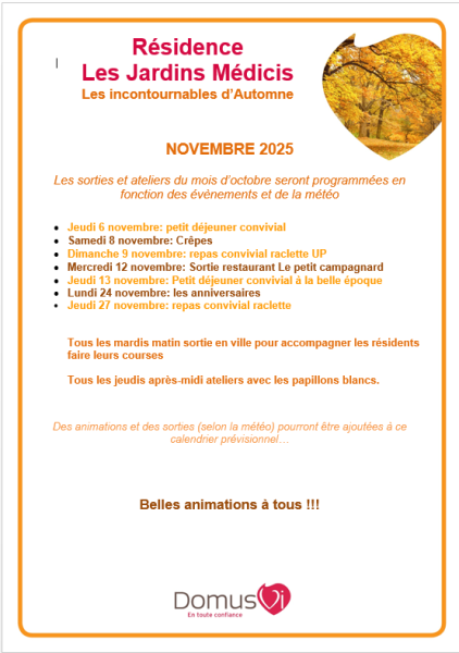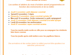 Nous avons le plaisir de vous partager le programme des animations pour le mois de novembre. Ce mois sera placé sous le signe de la convivialité, de la créativité et du bien-être.